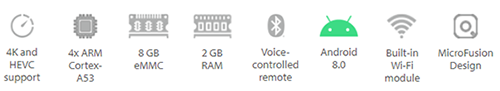Android 8.0, stemmestyrt fjernkontroll, 4K og HEVC-støtte, 2 GB RAM, 8 GB eMMC, USB × 2 stk. (3.0, 2.0), innebygd Wi-Fi-modul, HDMI-utgang